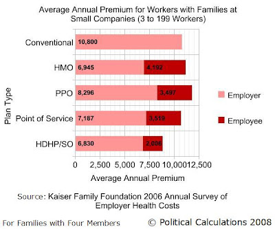 The next two charts present similar data for workers whose families are also covered by the various employer-provided health insurance plan types, first for those working at small companies (data is for a family of four):
